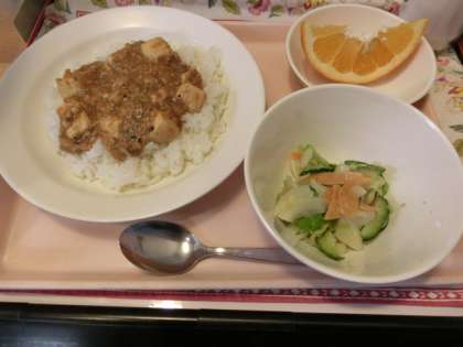 今日の給食「マーボー豆腐丼・パリパリサラダ・いよかん・牛乳」