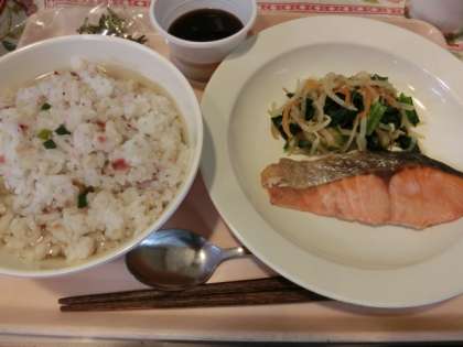 今日の給食「梅茶づけ・鮭の塩焼き・切り干し大根のあえ物・まっ茶黒みつ寒天・牛乳」