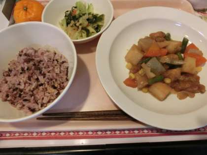 今日の給食「雑穀ごはん・鶏肉とじゃがいもの揚げに・わかめサラダ・牛乳」