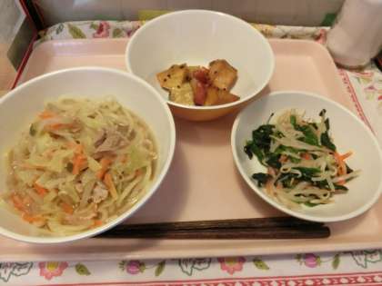 今日の給食「みそラーメン・塩ナムル・りんごいり大学いも・牛乳」