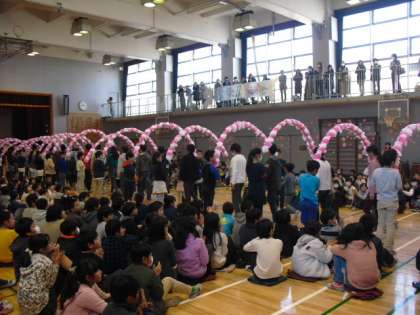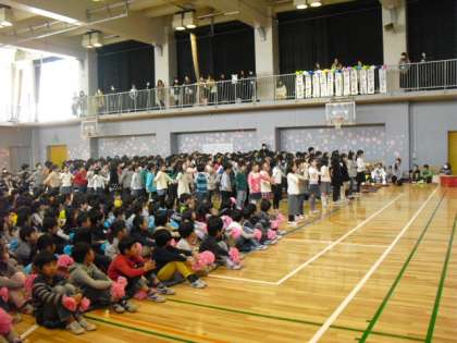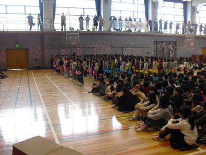 3月3日(金)に6年生を送る会がありました。第1部は3,4時間目体育館で全校児童が集合して行われました。1年生と手をつないで6年生は入場しました。6年生から1年生に声をかけている姿はとてもほほえましかったです。