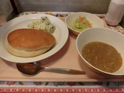 今日の給食「柏パン・キーマカレー・パセリポテト・キャベツサラダ・牛乳」