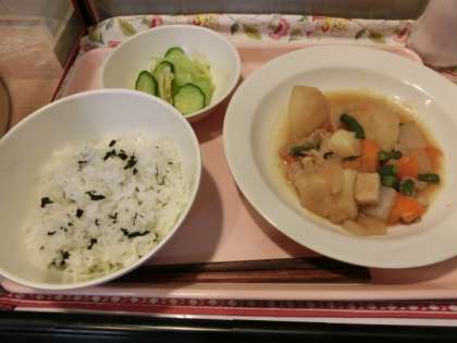 今日の給食「わかめごはん・肉じゃが・ひと塩やさい・牛乳」