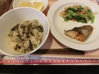 今日の給食「深川飯・サワラの梅肉焼き・野菜のごまだれかけ・はるか・牛乳」