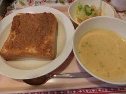 今日の給食「きなこバタートースト・キャロットポタージュ・春野菜のサラダ・牛乳」