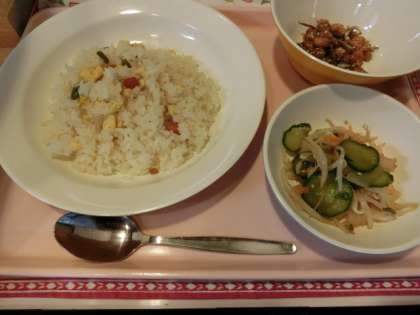 今日の給食「じゃこチャーハン・こんにゃくサラダ・大豆と小魚のあまからあげ・牛乳」
