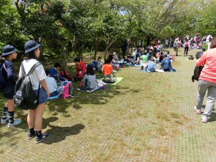 お弁当は源氏山公園で食べました。みんなのお弁当は空から、カラス、とんびが狙っています。傘で隠しながら食べている班もありました。
