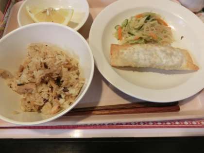 今日の給食「ちゅうかおこわ・棒ぎょうざ・春雨サラダ・ニューサマーオレンジ・牛乳」