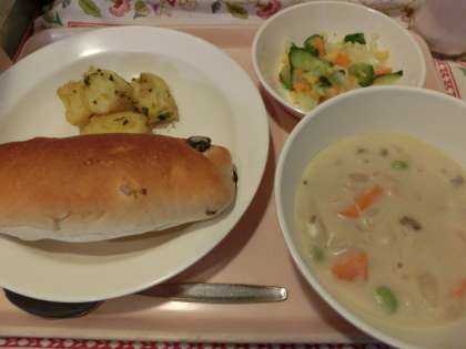 今日の給食「ぶどうパン・鶏肉と枝豆のシチュー・キャベツとコーンのサラダ・こふきいも・牛乳」