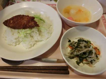 今日の給食「サメカツどん・ねばねばサラダ・紅白ポンチ・牛乳」