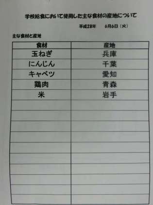6月6日(火) 給食食材産地