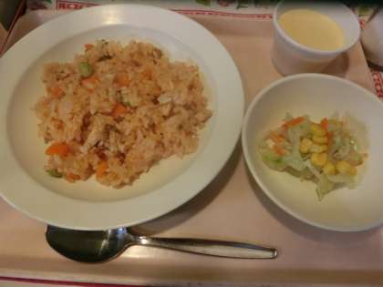 今日の給食「チキンライス・コーンサラダ・かぼちゃのプリン・牛乳」