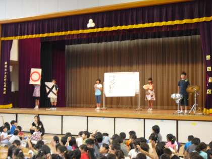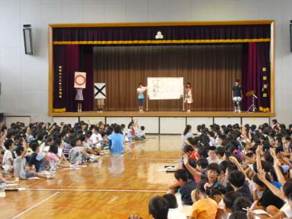 事前にクイズに答えておいて、正解を集会の中で発表し、ビンゴを狙いました!