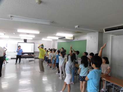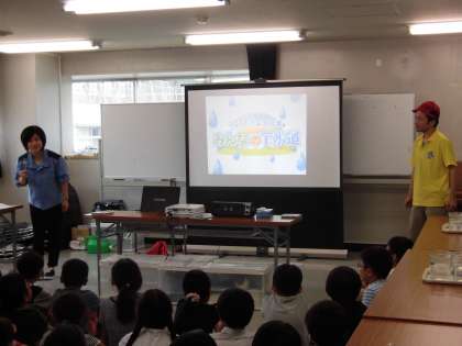 4年生は、社会科の学習で下水道の学習をしています。今回は、下水道局の方に来て、お話いただきました。水をろ過し、ごみときれいな水を分ける学習や、ティッシュペーパーとトイレットペーパーのとけ方の違いから、身近な生活を振り返る学習がありました。こどもたちは、身近な題材で、真剣に話を聞き、学びました。