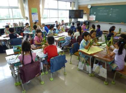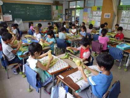 今日は、1・2年生ともに、トウモロコシの皮むきをしました。本校の栄養教諭のはからいで、毎年子どもたちに食べ物の大切さを伝えています。トウモロコシについて担任や栄養教諭から話を聞いたり、よくトウモロコシを観察したりし、食べ物について学びました。最後に今日の給食の為にみんなでトウモロコシの皮むきをしました。給食時、自分たちでむいたトウモロコシを食べ、「おいしい」と声があがっていました。