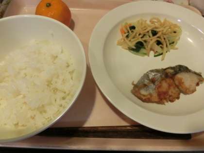 今日の給食「ごはん・サワラの梅肉焼き・バリバリサラダ・冷とうミカン・牛乳」