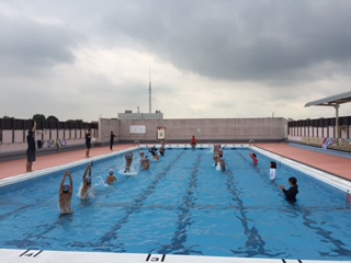 今日から、新しいリズム泳で水慣れです。先生たちが考案しました。低学年は「ドラえもん」、高学年は「勇気100パーセント」の曲です。みんな楽しくリズムに合わせて、水に慣れ親しみました。