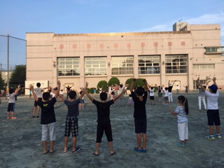 6時20分に校庭に集合してラジオ体操連盟の先生の指導のもと体をほぐし、6時半からのNHKのラジオ放送に合わせて行います。