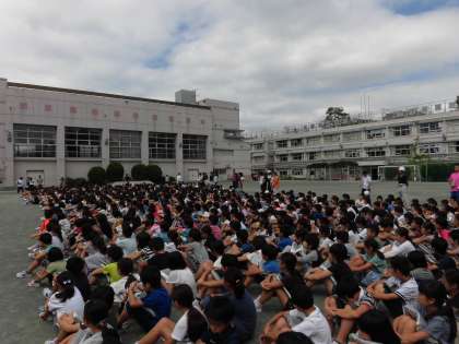 今日は、2学期初めての避難訓練がありました。今回の避難訓練は、地震が発生したあとの火事を想定した訓練でした。事前にどの場所から出火したか知らされず、放送で出火場所を知り、どの経路で避難するべきかを考える訓練でした。全学年速やかに避難ができ、とても立派でした。また、学校にいらっしゃった保護者の方々にも避難訓練に参加していただきました。毎月行っていく訓練には、しっかり取り組んでいきましょう。