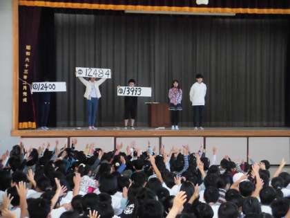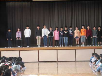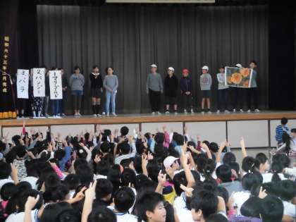 今日は委員会紹介集会がありました。発表は、図書委員会と園芸委員会の二つの委員会でした。どちらの委員会も委員会での仕事の紹介や、学校のみんなに知ってほしい内容を劇にしたり、クイズにしたりして、説明していました。学校の中にある本の冊数なども知ることができ、学校のことについて詳しくなりました。これからも5・6年生中心に委員会活動がんばってほしいですね。