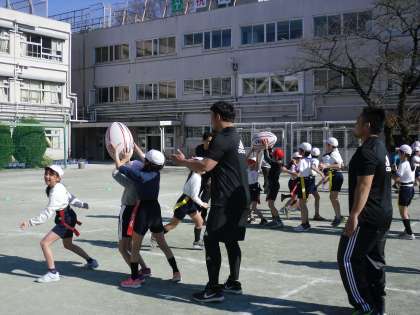 今日は、4年生のラクビー教室がありました。リコーブラックラムズの方に来ていただき、ラクビーの楽しさを教えてもらいました。学校では、タグラクビーとして体育の授業で取り組んでいます。大きなボールを使って走ったり、跳ねるボールを追いかけたりと体を動かす楽しさも同時に教えてもらいました。プロの方から教えてもらえ、よい経験になりました。