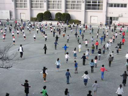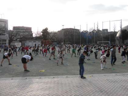 今日は、2・4・6年生の短縄朝会です。今年から新しくなったリズム縄跳び。基本的な前飛びと後ろ飛びを様々なスピードで跳んだり、駆け足で跳んでみたりと、色々な跳び方を織り交ぜてやっています。はじめは体育の時間や休み時間をつかって練習しました。朝会ではみんな、リズムよく楽しく跳んでいました。引き続き、体力向上に向けて続けていきましょう。