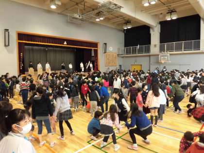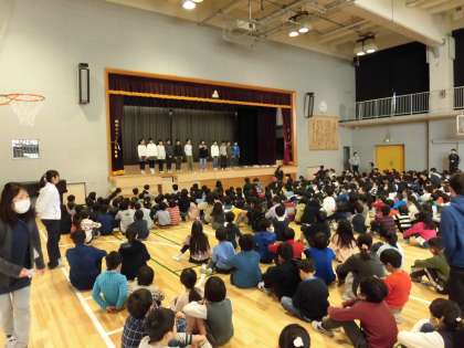 今日は全校集会を行いました。今日の集会は縦割り班の友達と一緒の活動です。各学年にちなんだクイズ問題が出て、全員で協力して取り組みました。仲良く他学年と協力して取り組み、楽しい時間を過ごせました。これからももっと仲良くしていきましょう。