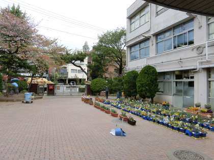 例年より早く満開を迎えた桜は、新学期を待たずして葉桜となってしまいましたが、正門付近では美しい花々が来校者を迎えてくれています。