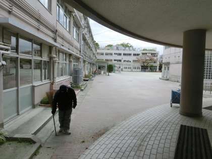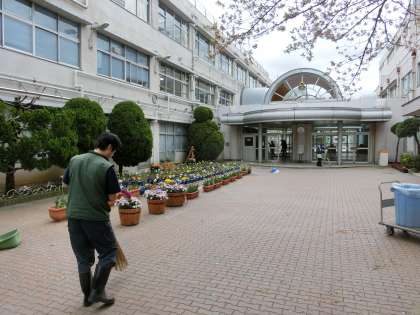 明日の新学期スタートを前に、主事さん方が朝から掃除に大童です。気持ちよく子どもたちを迎える準備が、校内のあちらこちらで着々と始まっている松丘小学校です。