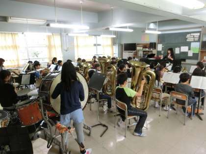 前日準備に大忙しの校内を歩いていると、快い調べが聞こえてきました。自然と足が音楽室へと向かい、扉を開けると、金管バンドのみんなが熱心に練習していました。演奏の合間には、礼儀正しい挨拶の声も聞こえてきて爽やかです。さて、明日はどんな発表を披露してくれるのでしょうか。楽しみです。