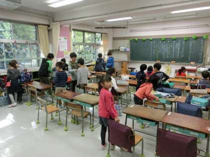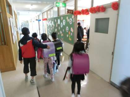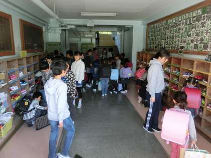 初登校となった新1年生を6年生たちが、優しくお世話しています。靴の履き替え、教室までの順路、荷ほどきなど、懇切丁寧に教えてあげてくれていました。松丘小のことをまだ何も分からない新入生も、頼もしい先輩がいてくれるから心強いですね。