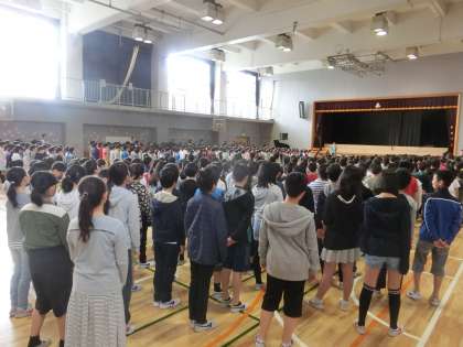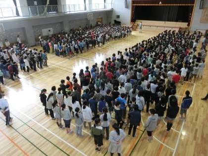 2年生から6年生が集合しました。音楽の先生が前に立つと、子どもたちはすぐに気持ちを集中させて、快く音楽朝会が始まりました。