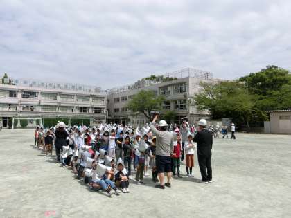 5分30秒で全体の安全確認が終了し、集まった子どもたちは、真剣な態度でじっと座っていました。1年生のみんなもがんばりました。私語がないおかげで、放送機器なしの肉声でも、850人の仲間たちへ先生のお話が確実に届いていました。素晴らしい!!