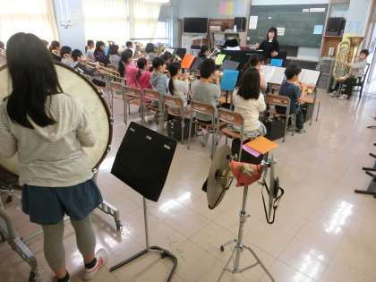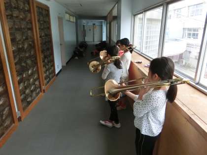 始業前の職員室で執務中、体育館の方から、♪ポニョ、ポニョ、ポニョ♬と演奏が聞こえてきます。朝の松丘小らしさとも言えそうです。仕事の手を休めて、音楽室まで観に行ってしまいました。金管バンドのみんなが練習をがんばっていましたよ。
