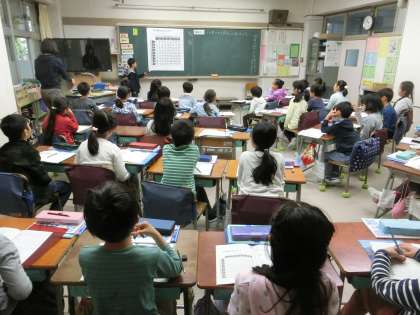2年生でマスターしたかけ算九九の発展学習です。九九表をよーく見ると、色々な気付きが出てきます。それをクラスのみんなとシェアしながら、九九のきまりに対する理解を深めていました。前に出て、指示棒を使いながら、自分の考えを発表している姿は先生顔負けでしたよ。