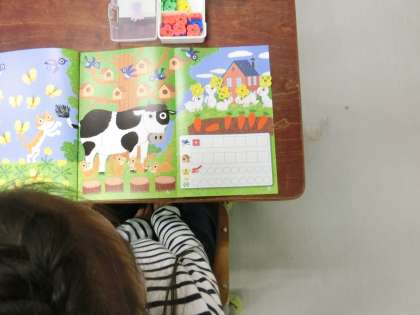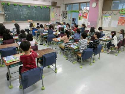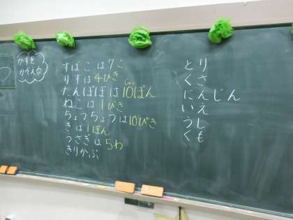 1年生の教室にお邪魔したら、おはじきを使って、教科書に載っているうさぎの数をかぞえていました。と同時に、その対象物にふさわしい単位についての学習も同時並行していました。「5ひき、です。」と自信たっぷり答えるかと思いきや、なんと「5わ、です。」という模範解答が。1年生、すごいっ!!