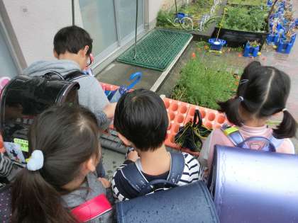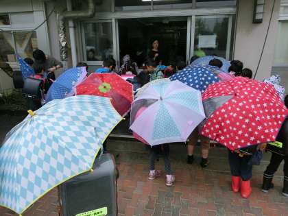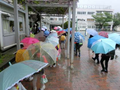 さしてきた傘をきちんと束ね、傘立てにしまうことが今朝の大切な目標でした。特に1年生にとっては、学校では初めてとなる体験であり、押し合わずに上手にしまう実践の場となりました。6年生も出迎えて、アシストしてくれていました。