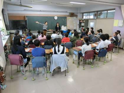 5・6年生がお世話になる英語活動支援員の先生とのご対面です。早速、英語でコミュニケーションがスタートしていました。一年間、よろしくお願いします。