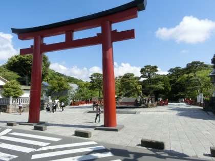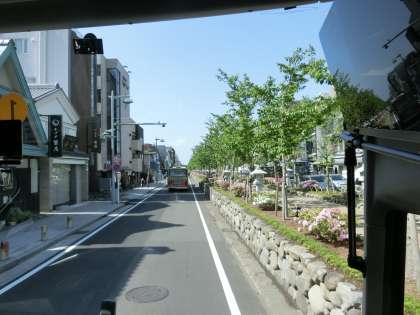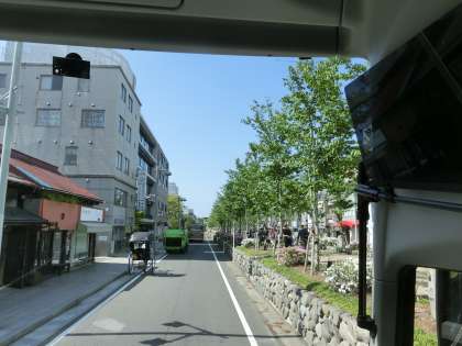 バスに揺られること一時間あまり、窓の外は晴れ渡った空と鮮やかな新緑が広がる鎌倉の風景に移り変わりました。これから巡る鶴岡八幡宮、ツツジが咲き誇る段葛に目を奪われつつ、若宮大路を走って行きました。名物の人力車も併走していましたよ。