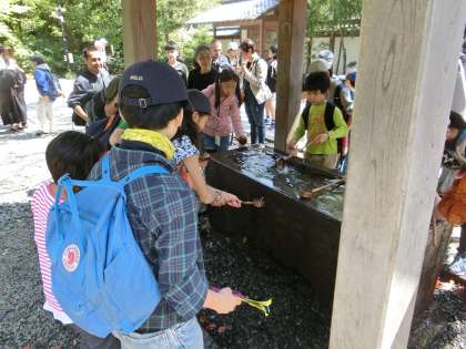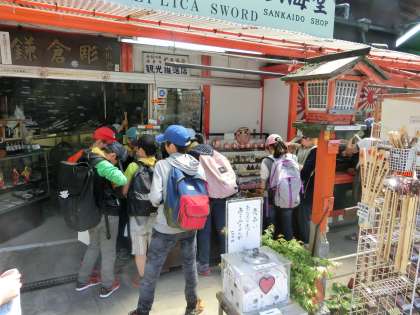 ちょっぴり迷子になりかけたグループもありましたが、ゴールの高徳院に6年生全員が集合です。午前中、お土産を買いそびれた子は、ここで物色に夢中でした。ひざしでほてった手を清めているグループも見られました。