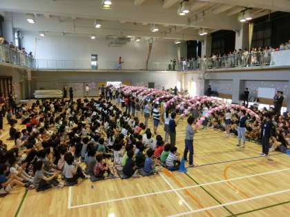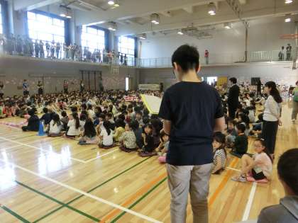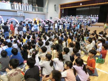 子どもが司会進行役を務めます。金管バンドの演奏と拍手に迎えられ、6年生と手をつないだ1年生が入場してきました。