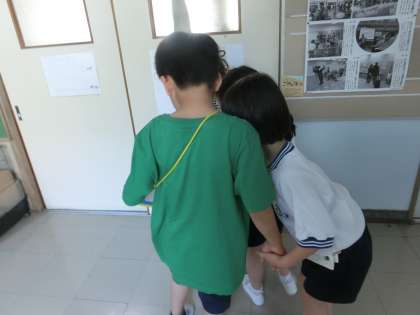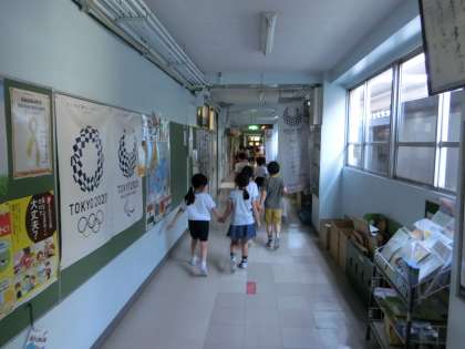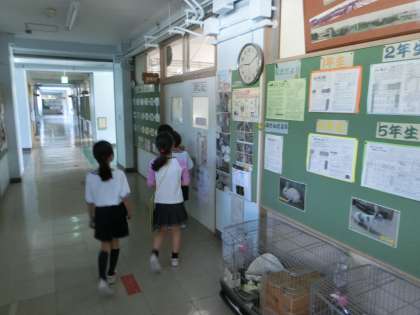 2年生が1年生と手をつなぎ、学校案内をしています。