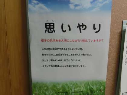 お連れになっていた園児が図書館前で転倒した際、たまたまそこを通りかかった下校中の2・3年生位の子数人が、「大丈夫?」と声を掛け、そのお子さんへ進んで手を差しのべたそうです。ごく自然発生的な、優しさあふれる行動にいたく感激され、そのお気持ちをわざわざ届けてくださったという訳です。本校児童の行動を価値付けするお言葉、たいへん有難かったです。