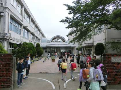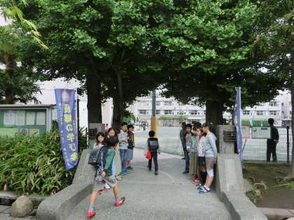 5年3・4組のみんなが正門と南門で呼びかけを行っています。肌寒い、曇り空の朝ですが、爽やかに一日がスタートしています。