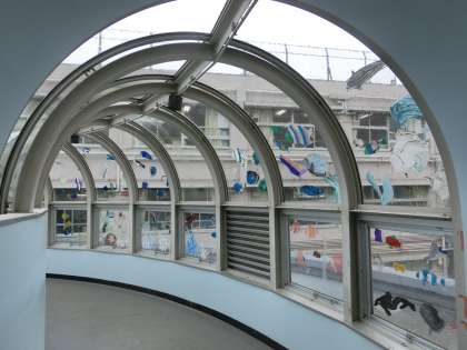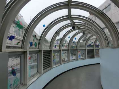 雨の展望廊下はさながら水族館。降りしきる雨に濡れたガラスが、まるで水中廊下を歩いているような感覚へといざなっています。