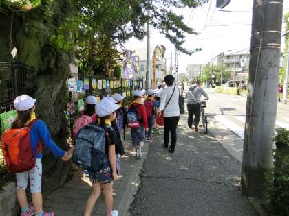 一人のお休みもなく、151人全員が揃っての出発となりました。これは、素晴らしい! ニコニコ笑顔で学校をあとにし、砧公園へと向かいます。交通安全のめあてを守って、上手に歩きましょうね。