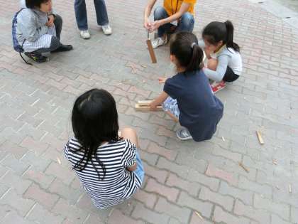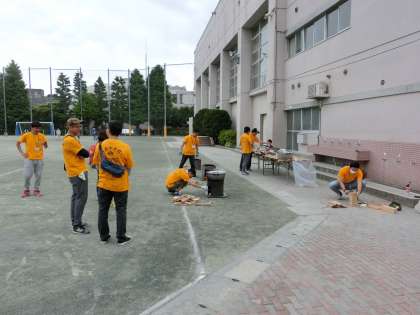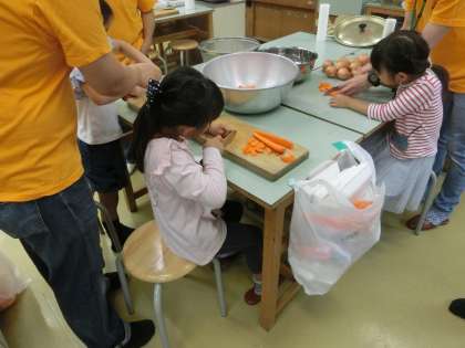 松パパクラブの皆さんによるカレーパーティーのお昼です。野菜を切ったり、薪を割ったりのお手伝いに子どもたちも加わっています。空模様が心配ですが、11時現在は屋外においても作業を実行中です。