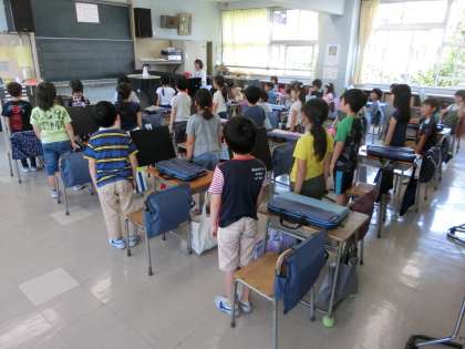 2年生が「運動会のうた」を2つのパートに分かれて歌っています。子どもたち、紅白対抗的な活動になると俄然スイッチが入るものです。力強い振り付けとともに、本番でも相手チームに勝つぞという意気込みが、歌唱にも表れていました。