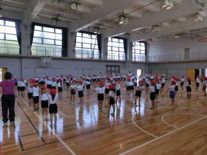 運動会練習を行っている気配を感じて、体育館をのぞいてみたら、ちょうど「ニコニコ パタパタ」の合図に合わせて、振り付けをマスターしている2年生の姿がありました。顔つきもニコニコになっていてナイスですよ。