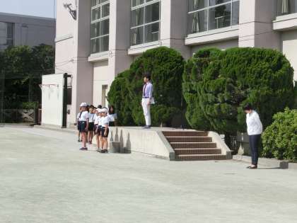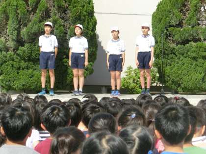 朝から強い日差しが照りつける中、6年生の代表4人による一言と挨拶から全校朝会が始まりました。元気に全体のモチベーションを牽引してくれました。